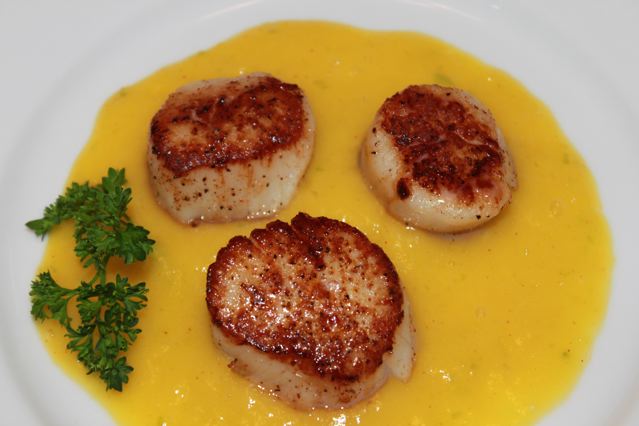 Mango Scallops With Pomegranate Wild Rice - Carrots ,water let sweat till soft on a low heat 3.then add your cream and mango puree 4.let reduced still thick consistency and blend and passed through fine chinois.