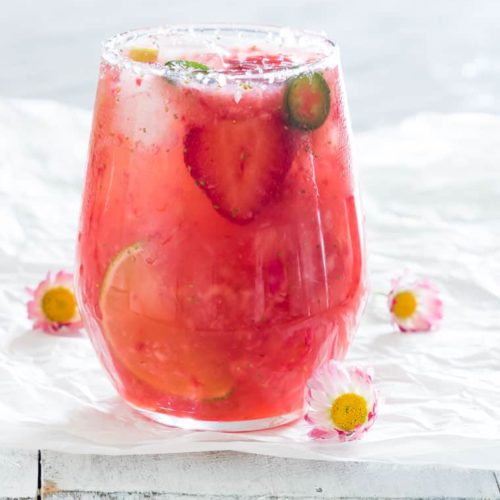 Strawberry Jalapeno Martini Strawberry Jalapeno Martini / 3 strawberries 1 slice of jalapeno 1 lime wedge 3 ounces vodka 1 ounce grand marnier 1/2 ounce simple syrup.